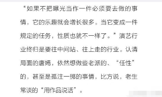 采访中,唐嫣还提到“大家觉得我没在忙,其实我很忙啊......”对于外界的误解,她表示解释是没有意义的,因为相信的人不需要解释“如果不把曝光当作一件必须要去做的事,它的乐趣就会增长许多。”