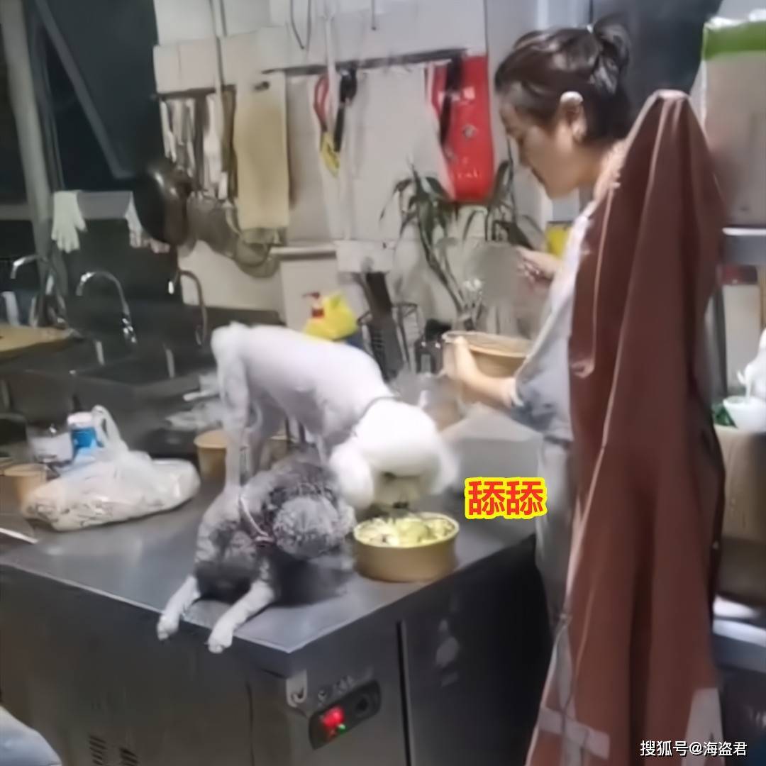 浙江杭州,一个店家在制作轻食餐时,两只狗在操作台上又闻又舔,而店家却根本不当一回事。