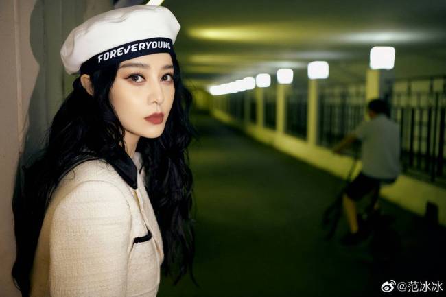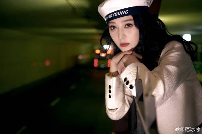 范冰冰身穿白色大衣,头戴“foreveryong”的水手帽,她俏脸成熟妩媚,樱桃小嘴,乌黑的秀发飘逸,她靠在地道边上,美得让人心动。