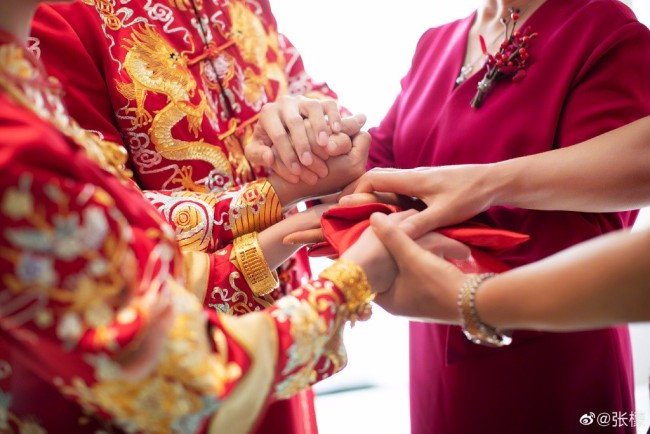 20日,张檬与金恩圣在海南三亚举办婚礼。张檬上传一组婚礼现场图片,两人同穿红色刺绣喜服,跪地向父母敬茶,父母也给这对新人包了大红包。照片中,两人互动满满,彼此亲吻,小五喂张檬吃东西,两人眼中皆是对方,笑意盈面,画面温馨幸福。