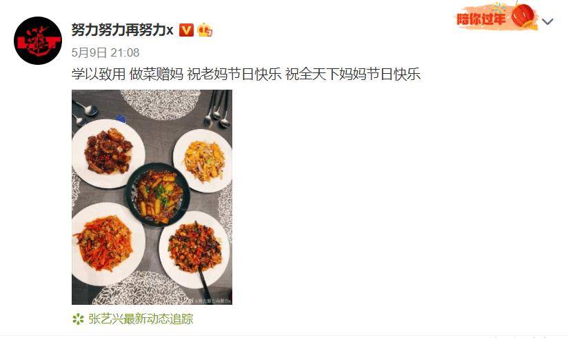 在母亲节的这一天,张艺兴也更新了自己的微博动态,晒出了自己跟妈妈庆祝节日的照片。这一次过母亲节,张艺兴学以致用,将在《向往的生活5》中学到的厨艺用在了节日上,做了满满的一大桌子的菜。