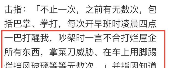 他还表示,在一起生活的时候,她经常对自己拳打脚踢,即便是在上班之前,也会遭到她的一巴掌,本来好好的心情,被她整得瞬间崩溃,不仅如此,在吵架的时候,她还经常砸烂家中的东西,气急败坏时,拿着菜刀威胁我;在车上吵架时,也控制不住暴躁的脾气,用脚把挡风玻璃踹得稀烂。