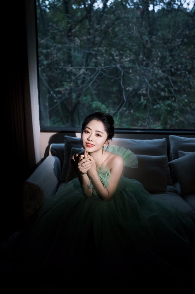 谭松韵身着薄荷绿薄纱裙 大眼灵动明媚动人