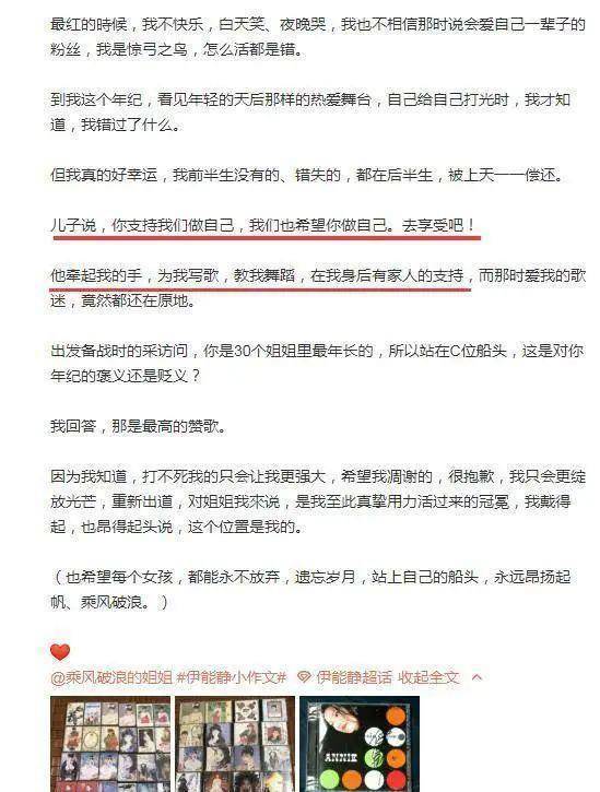从这里能看出伊能静思想较为时尚,始终秉持支持儿子做自己的态度,这句话被伊能静特意放在文中,似乎也是默默声援儿子的一种表现,让他不必理会外面的流言蜚语,勇敢无畏地做自己。