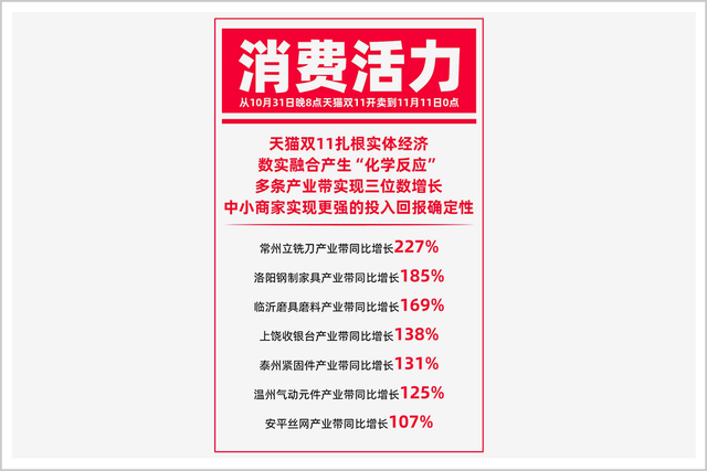从10月31日晚8点天猫双11第一波售卖启动到11月11日0点,全国多条产业带的整体成交额同比实现三位数暴涨。