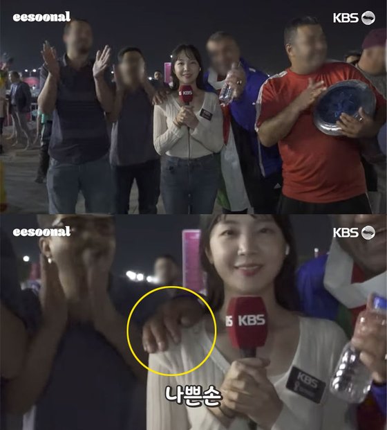 原标题:韩国女记者直播世界杯遭球迷强搂 面带微笑继续主持