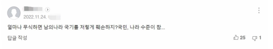 另一位韩国网民则讽刺道:“这得多无知才这么损毁他国国旗啊?这个国家和那里的国民水准可真是……”↓