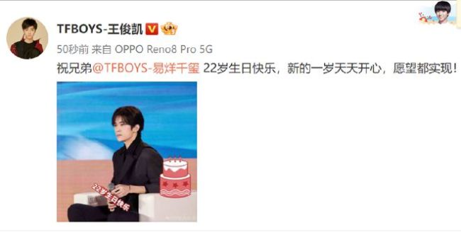 11月28日是易烊千玺22岁生日,王俊凯、王源卡点为他庆生。王俊凯写道:“祝兄弟22岁生日快乐,新的一岁天天开心,愿望都实现!”王源表示:“千玺生日快乐,祝你22岁收获更多勇气和温柔。”