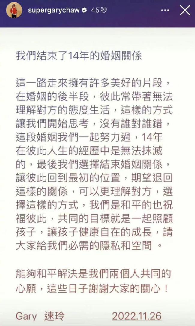 26日,曹格、吴速玲在社交平台发文,宣布离婚。文中写道:“我们结束了14年的婚姻关系”,以及“我们是和平的也祝福彼此,共同的目标就是一起照顾孩子,让孩子健康自在的成长。”27日,吴速玲通过经纪人回应离婚一事,“结束婚姻关系对我们而言都是新的开始,我们会以朋友的身份持续关心彼此!恳请网友少一点谩骂,多一些支持和鼓励!”
