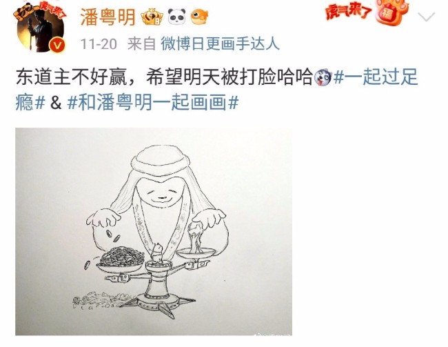 此前,潘粤明也一直收看世界杯比赛,并在社交平台发布关于比赛的简笔画,表达自己对足球的喜爱。