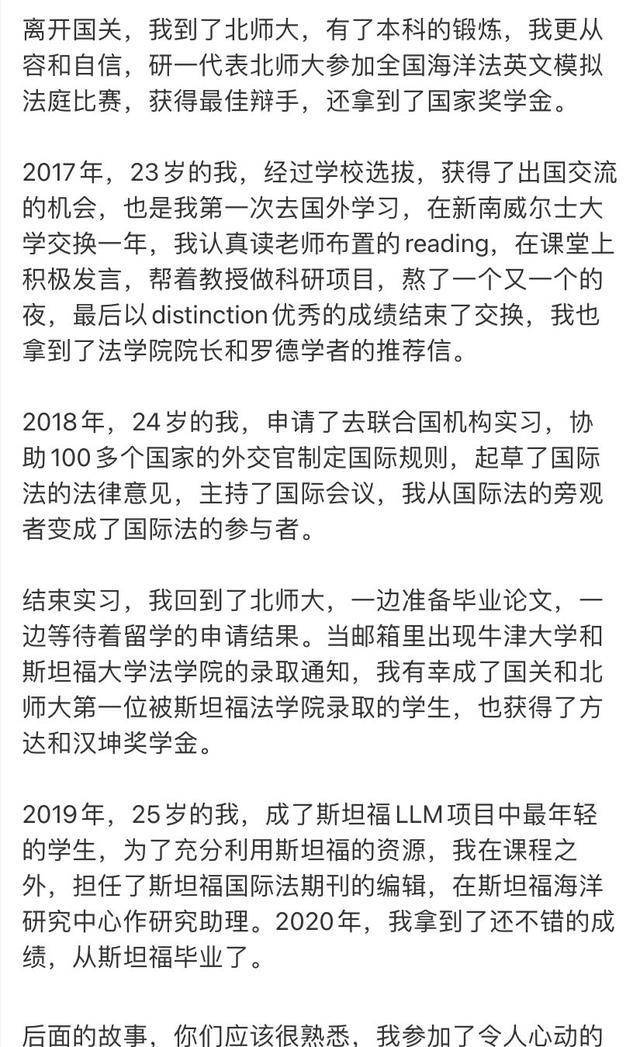 大学毕业以后,进入到北师大,之后他依然一直憋着一口气,从来没有让自己放松过,研一代表北师大参加全国海洋法英语模拟法庭比赛,获得最佳辩手,拿到国家奖学金,23岁经过学校选拔,获得国际交流的机会,24岁申请去联合国实习的机会,25岁成了斯坦福LLM项目中最年轻的学生……