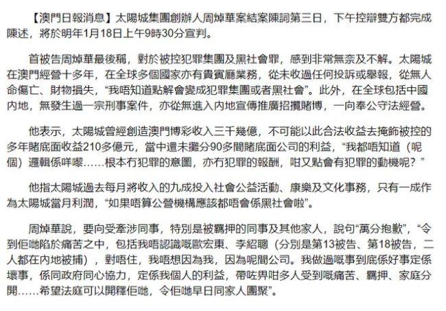 周焯华也指太阳城过去每月将收入的九成投入社会公益活动、康乐及文化事务,只有一成作为当月利润,他认为自己公司是“公营机构”。最后,周焯华向其余多位涉案人员道歉,“万分抱歉,令到他们陷于痛苦之中,对不起……我做过的事到底是好事还是坏事?我带给那么多人痛苦,令他们跟家人分开……希望法庭可以开释他们,让他们早日跟家人团聚。”