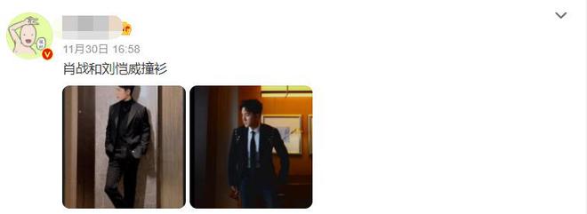 发展到半响,终于找到了一个可以声讨肖战工作室的一个话题,视界大会微光盛典内场的第二套造型和男演员刘恺威早起活动撞衫了,这锅没有争议的被造型团队背了。