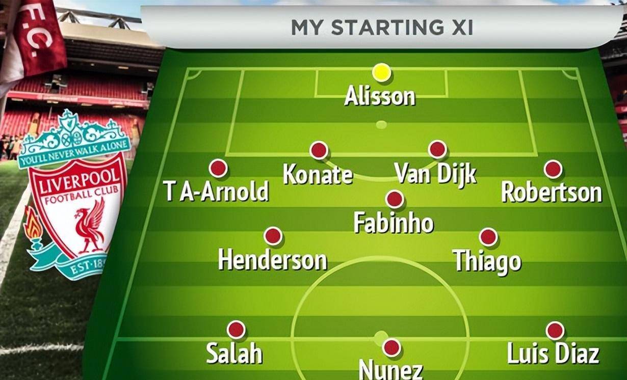 潜在阵容:阿利松;亚历山大-阿诺德、科纳特、范戴克、罗伯逊;亨德森、法比尼奥、蒂亚戈;萨拉赫、努涅斯、迪亚兹。