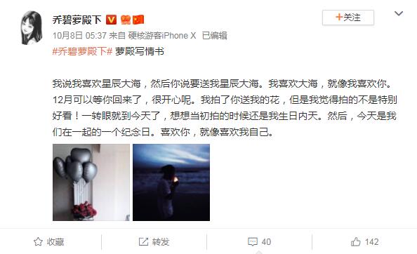 不过呢,乔奶奶还是非常善于给自己找画面的。在10月8日乔奶奶发布了一条“萝殿写情书”,像是写给自己的男友的。乔碧萝称当天是与男友在一起的纪念日,并且还配文男友送给自己的花。