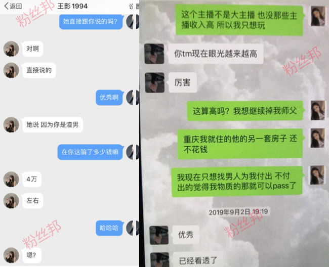 其现任男友称自己在女主身上花费了4万块左右,女主与其在一起后说斗鱼渝万COO是“渣男”。而“悠哥哥”爆出的女主聊天记录里,可以看出女主是一位“物质女”她声称想钓自己的“师父”,并且表示还住在其师父的一套房子里不花钱。