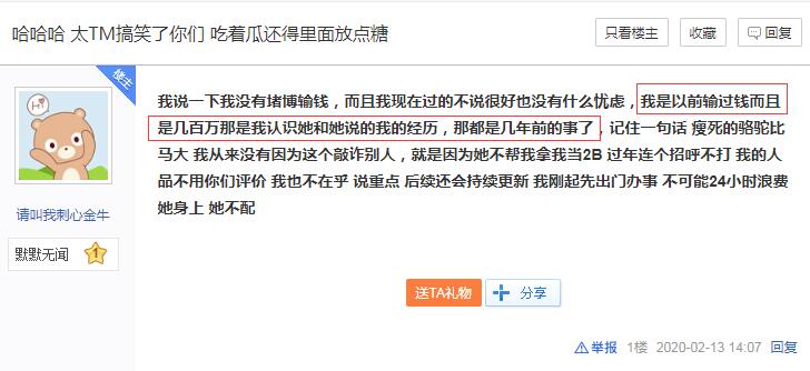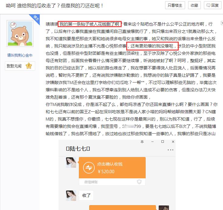 不过在陆七七的道歉直播之后,贴吧的爆料贴被删除,而这位前管理也是再次发帖,讲述陆七七所言并不属实。
