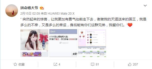 目前杨大爷已经在慢慢“复苏”,粉丝神豪大哥都在不断的增加。截止目前杨大爷直播间“珍爱团”已经有4400多位成员,直播间守护数量也是超过了70位。为此杨大爷还专门发微博进行纪念,感谢众多神豪粉丝对自己的支持与厚爱。