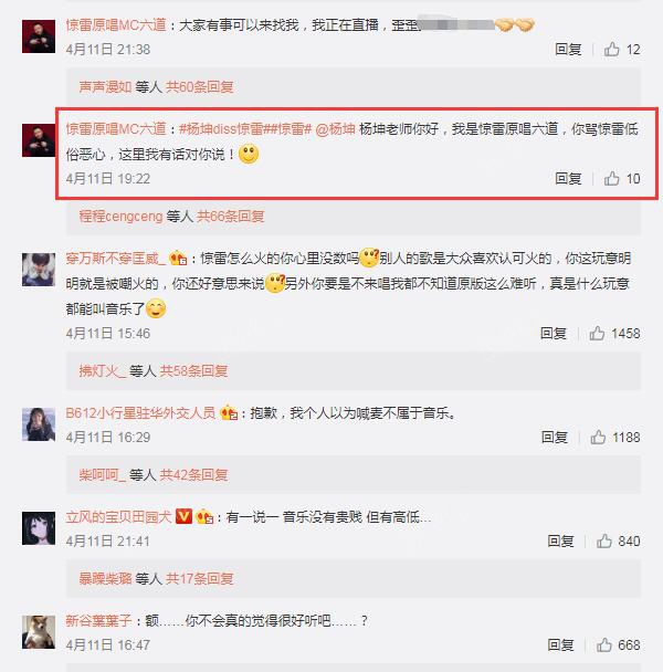 在杨坤老师对《惊雷》一顿猛批后,YY主播MC六道回怼杨坤diss:
