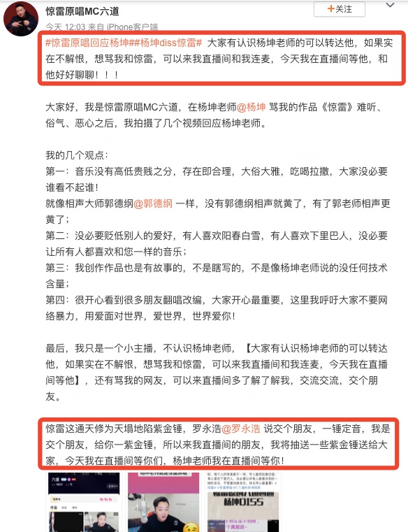 杨坤diss《惊雷》俗气,原唱MC六道喊话其连麦对质,比你任何歌都火
