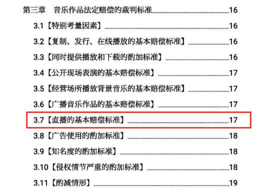 在《指导意见》第三章中,有关于音乐作品法定赔偿的裁判标准,其中3.7条有专门对于直播的基本赔偿标准。