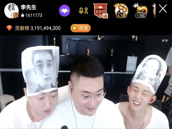 对于在李先生生日会生,同为“MLZ组合”的王冕、小洲两位主播,用同平台阿哲、和毕加索的黑白照片做成了一顶“帽子”给戴在头上。