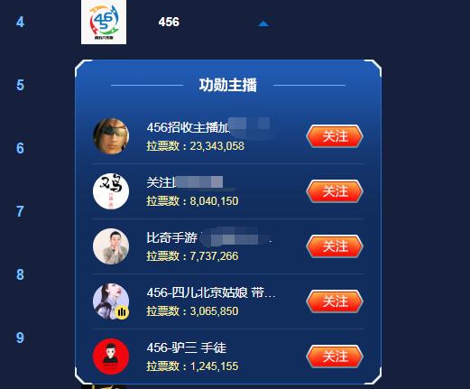 经过2小时的直播拉票,天佑拉票近2300多万票,成为“456公会”主播功勋榜第一名。