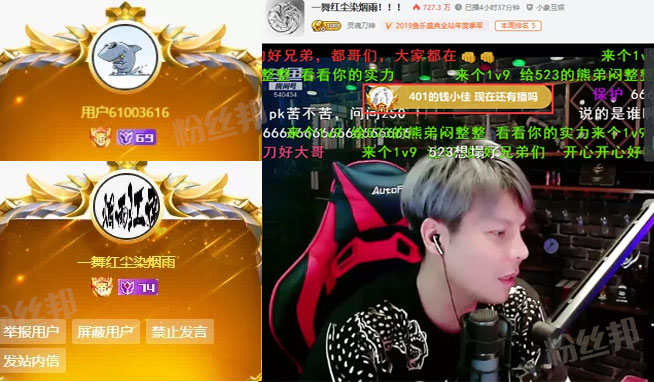 虎牙神豪“523房倒屋塌”在虎牙非常支持血色公会主播,对骚俊、刀疤龟等曾经“烟雨楼”的主播都豪刷无数。