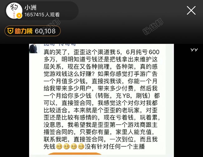 比奇哥透露自己在5月6月两个月,已经亏损了600多万,并且还一直亏着钱维护YY上的这层关系。