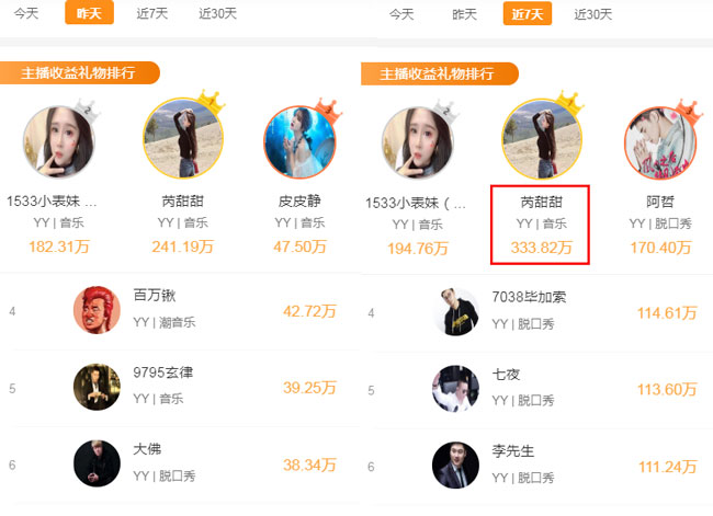 而芮甜甜在此次头条活动中,回归2天榜单就达到了333万之多,芮甜甜确实是YY上的第一吸金电母。
