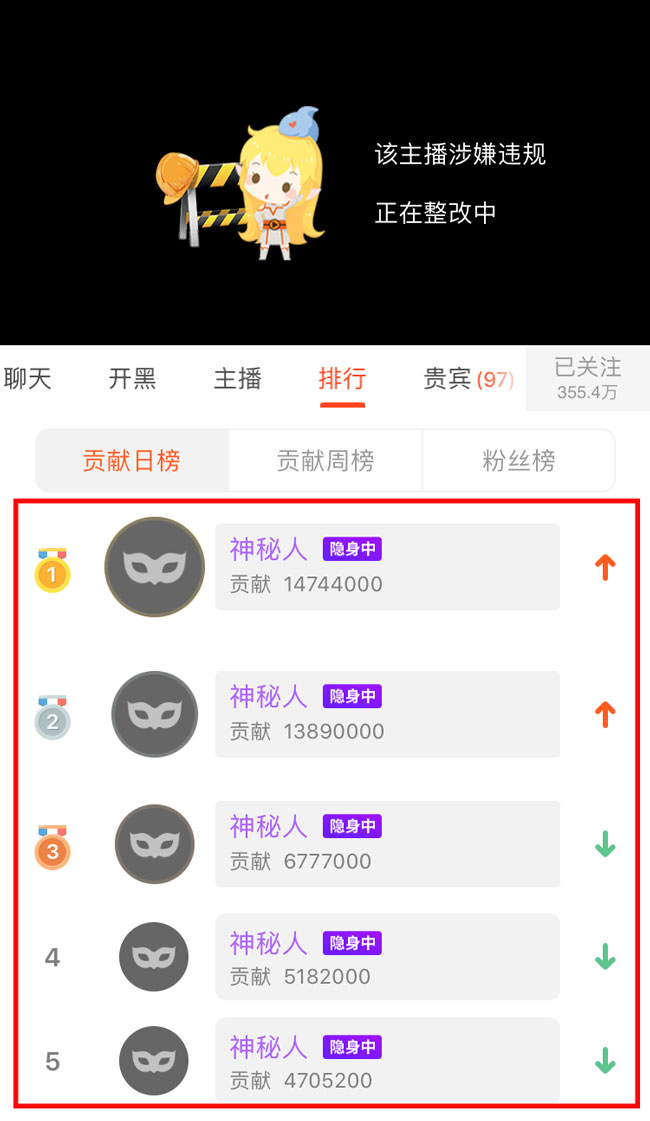 而这五位隐身的“神秘人”土豪仅仅在9月30日当天,以贡献榜日榜数据可以看到为她豪刷452万RMB的礼物。