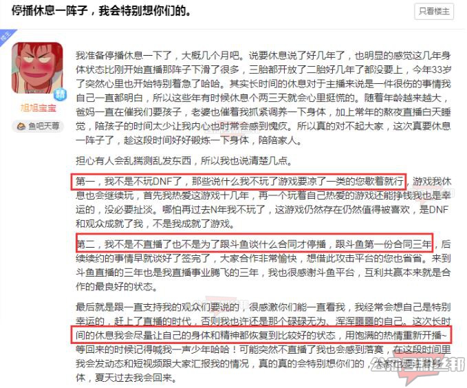 他表示不是放弃游戏不玩DNF了,也并非是因为跟斗鱼的合同问题,他很感谢感谢斗鱼,和斗鱼互利共赢合作得很好。