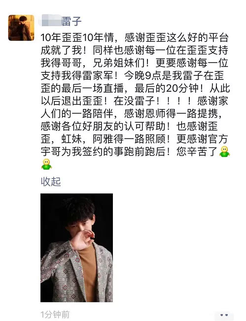 可是在1月13日,舞帝雷子却发文要告别YY了。他讲述10年的YY,很感谢YY成就了他,并且会在当晚进行自己“最后一场直播”。雷子的最后一场直播,或许也是想用20分钟的时间和粉丝们正式道别,从此以后他会退出YY。