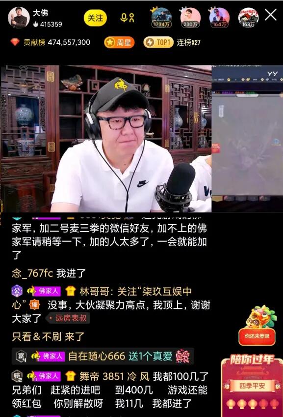 大佛直言现在的YY上哪还有大哥钱呢,若不是靠着游戏礼物都很难收到之类的话。大佛也是苦口婆心让粉丝都往里进,但始终没啥效果说了半天也就100来个人。