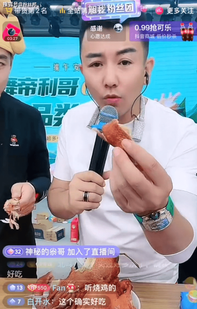在舞帝利哥生日会的直播带货中,又上架了某款热门产品“烧鸡”,因为有“烧鸡”的梗让小洲三番五次的拿这个开涮,并且编造一些粉丝吃烧鸡吃懵了。