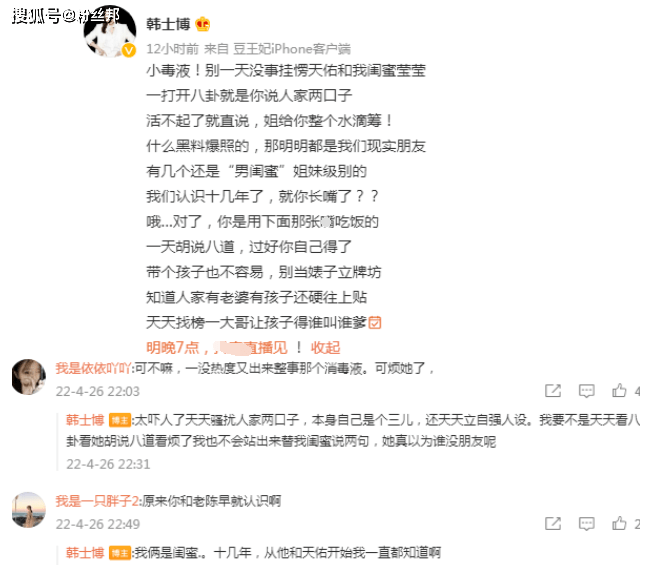 在小毒液和陈静莹“隔空”对话后,网红主播“都姐”韩士博也出来力挺陈静莹她发文维护陈静莹,喊话小毒液别一天“刮楞”天佑和自己的莹莹闺蜜。