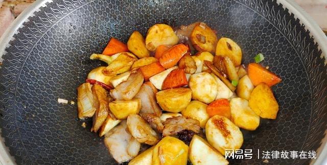 第六步:而后将胡萝卜块和茨菇块都下锅翻炒个30秒钟,再加入生抽,老抽和蚝油炒匀,使食材均匀被上色,再加入开水2碗。