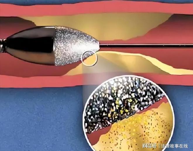 此种临床治疗方式,会利用高速旋转的,带钻石颗粒的旋磨头,突入血管当中的钙化斑块处,把其磨成比红细胞,还要微小的颗粒,然后再会随着血循环流动到冠脉远端,以此来达到一个清除钙化斑块的作用。