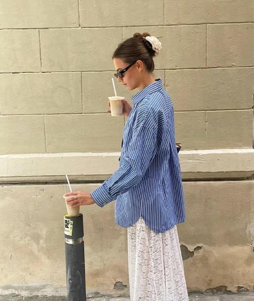 蓝白条纹衬衫+白色半身长裙,这两种颜色组合一起,真的贼好看的,很清爽干净。