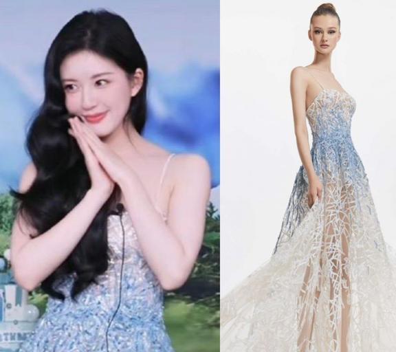 2023年11月6日,品牌直播活动,穿了一套来自Tony Ward 2021秋冬定制系列的蓝色碎钻装饰镂空礼服。