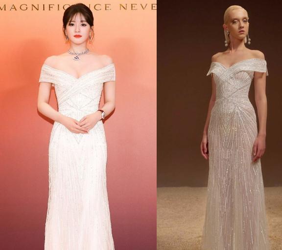 2023年6月13日,参加品牌新店开幕活动,穿的银色露肩钉珠礼服来自Georges Hobeika 2023秋冬婚纱系列。