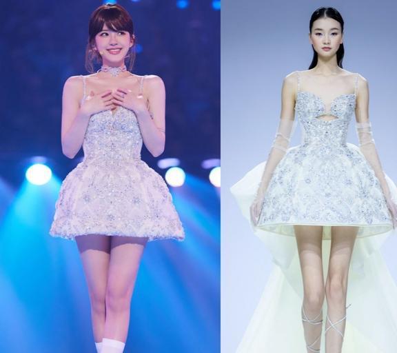 2023年12月31日,身穿来自Ronald van der Kemp 2021秋冬高级定制系列的彩色条纹拼接抹胸连衣裙亮相2023-2024湖南卫视跨年晚会。