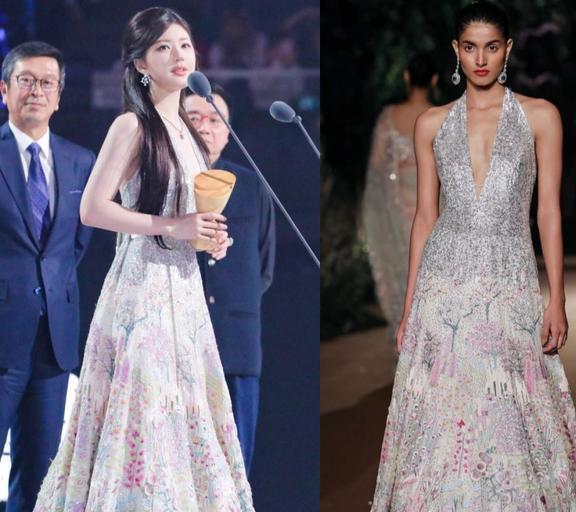 2023年12月17日,身穿Rahul Mishra 2023秋冬高级定制系列珠花刺绣深V挂脖礼服亮相2023星光大赏。