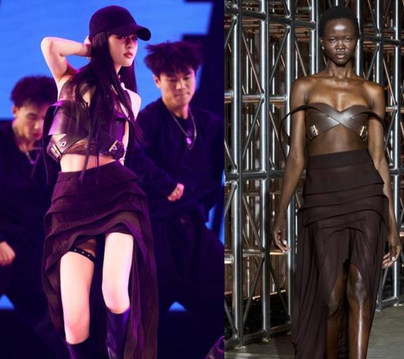 2023年11月9日,「lulu land」见面会,穿的棕色皮革绑带抹胸、皱褶半身裙来自Dion Lee 2023秋冬系列。这次见面会上换了好几套服装。