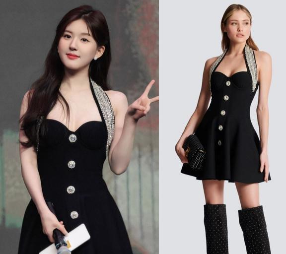 2023年6月27日,这套穿搭同样来自《偷偷藏不住》发布会,穿的黑色晶饰连身短裙来自Balmain 2023早秋系列。
