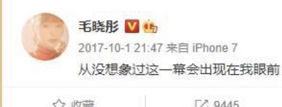 2017年10月1日,毛晓彤在社交媒体发布:“从没想象过这一幕会出现在我眼前”。