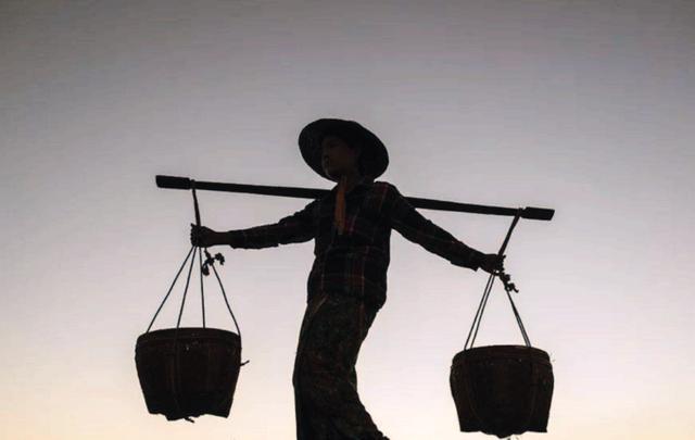 轧米来时两只箩筐都均匀装着谷,回去时,一头装着糠,一头装着米,就一头轻一头重没法挑。于是就用一只畚箕装上部分米,放到装糠的箩上,这样两头重量平均了。