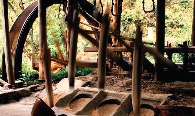 还是儿童的时候,在大队公房里有个米碓,人工舂米用的,一个大石臼,石臼上方悬着个锤石,锤石连着一根长木头,长木头的半中部的某个位置下方有个横杠,这个横杠是个支点,利用杠杆原理让人在这个木头的那头轻轻踩下,这边的锤石抬起,脚拎起锤石落下,大石臼里放着谷,人去操纵锤石,谷子慢慢舂成米。