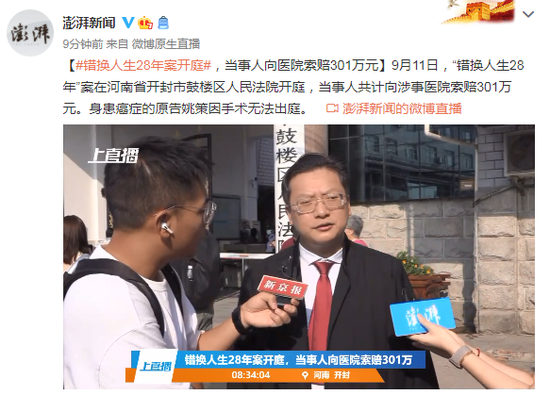 9月11日,“错换人生28年”案在河南省开封市鼓楼区人民法院开庭,当事人共计向涉事医院索赔301万元。身患癌症的原告姚策因手术无法出庭。