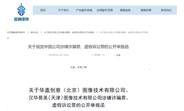 4月10日,雷腾律师事务所在官网发布“关于视觉中国公司涉嫌诈骗罪、虚假诉讼罪的公开举报函”,并直言“大恶,不容于国”。